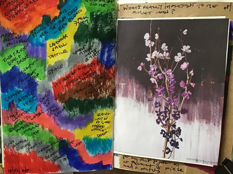What I intend to do and what I’ve been doing is to remain curious and allow myself to be intuitively guided towards what I feel I want or need to do. Okay I might have to do some dishes or we’ll be eating off our hands all day. But at the same time, I’ve been visiting my visual journal and experimenting with my resources; journalling, moving paint around, doodling, dreaming. Being creative but just enjoying the process and not really thinking about the end product.