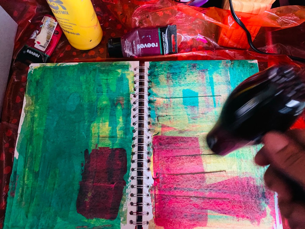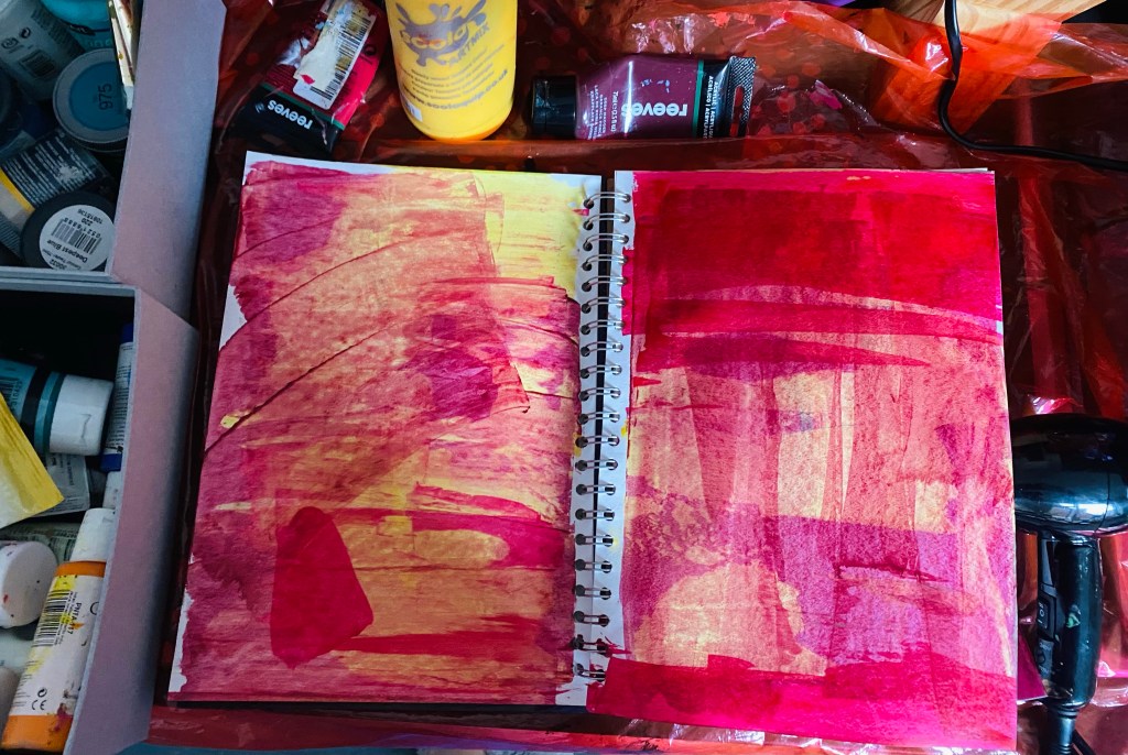 Every time I go into the kitchen, I create a spread. I smear drops of paint across the page with the disused credit card. I can feel my energy, my excitement and joy rising.