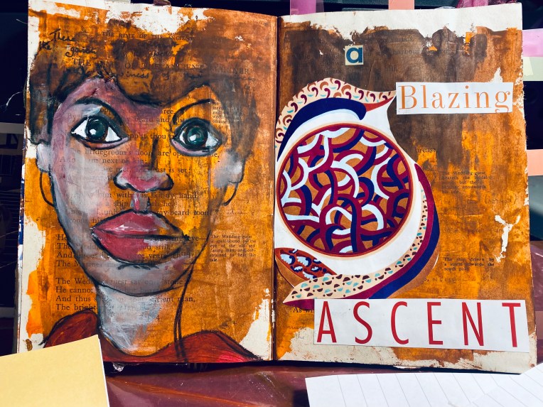 One thing that has been on a constant burn, a low humming of heat over these last 4 or 5 months has been my visual journaling practice. The image above was created today at my table in the corner of my bedroom where I’ve gotten into the habit of turning up daily just to see what wants to appear. I’ve been listening to the ancestors, the guides who want to speak. I’ve been enjoying the process.