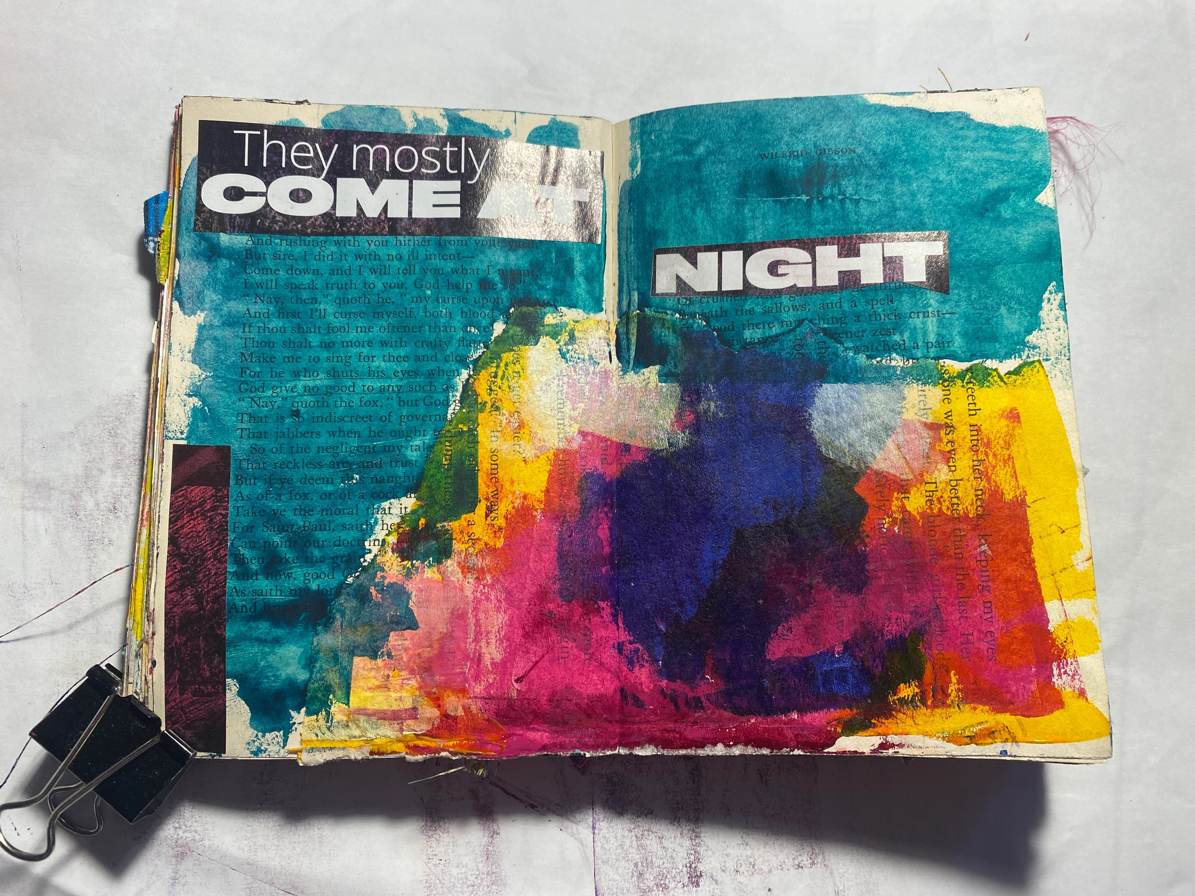 Since November 2023, I’ve been practicing this little old practice of getting into my creative corner and creating/ being. Usually in altered books, or homemade junk journals or hand sewn books. Moving my hands to smear paint across a page, adding text and images, and stickers and sometimes even crafting found poems from cut-outs, makes me happy. I can say that now because I’ve had months of this practice under my belt. And I feel better because of it.