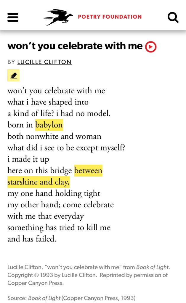So today – Day 1, I share a favourite poem from Lucille Clifton.