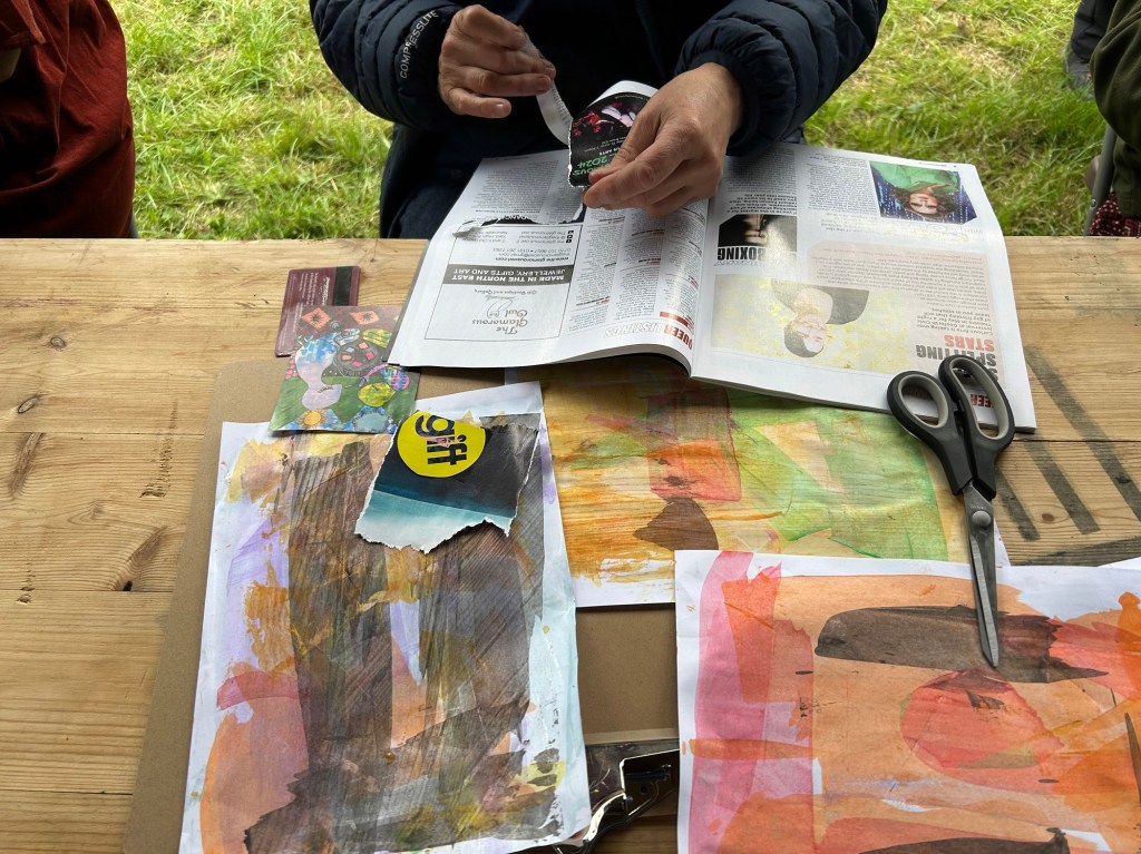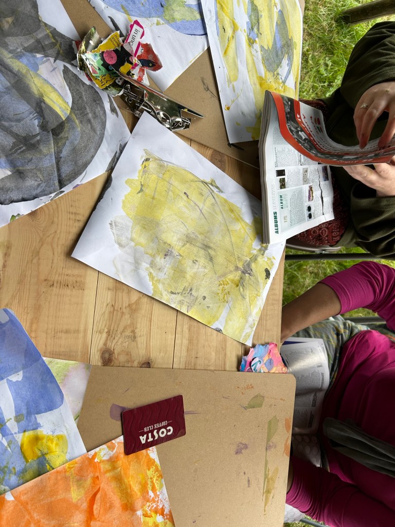 When we’re out in the field, literally here, exploring visual journaling we use just sheets of A4 paper and cover them in paint. Once we’ve got enough we fold them into a book and start searching for images and text.