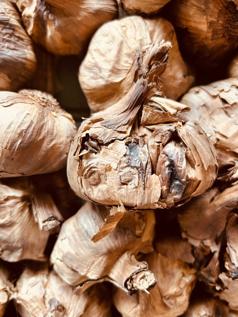 Aged garlic, deep coloured. Dark brown to black cloves. An ancient East Asian practice of placing garlic in a warm, moist environment to allow the cloves to turn black over time. Something new that crossed my path while visiting a garlic farm on the Isle of Wight last week. Something I got the opportunity to taste within a black garlic, chocolate and cherry cake. Yummy.
