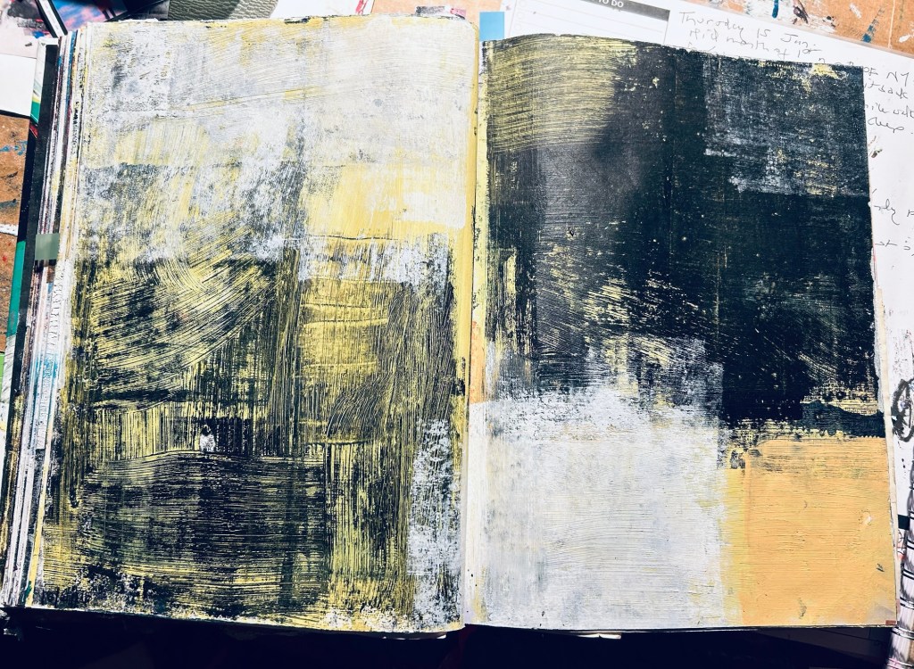 Here with these colour fields, there’s layers built up and then stripped back. Marked into. Scratched away to leave textures I like to see and feel. This practice is definitely expanding my palimpsest exploration and obsession.